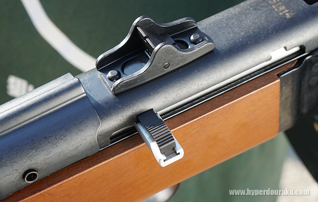 リアサイトは10/20と刻印のある2ブレード切り替え式。レシーバー右にはボルトハンドルがある。