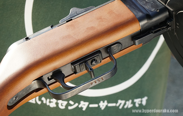 トリガー前にはセレクターレバーがある。手前がセミオート、前方がフルオー位置となる。
