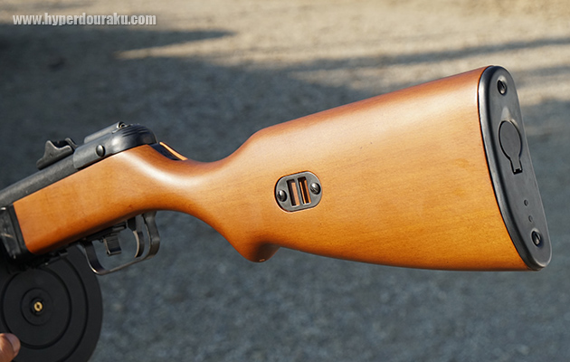 ストックはリアルウッド。まだ真新しく艶やかな仕上がりだが、使い込んでボロボロになった木製ストックも魅力的。好きな人はエイジング加工してみるのも良いかも。バットプレートは金属製。