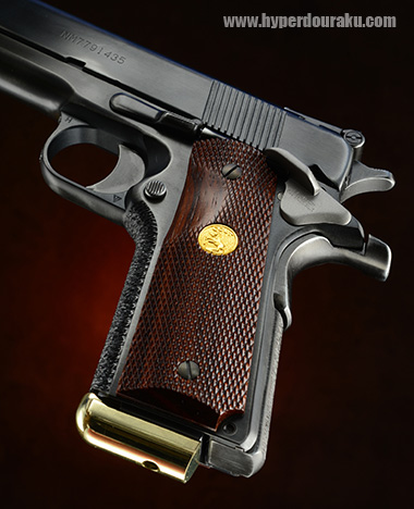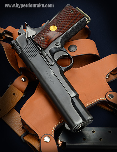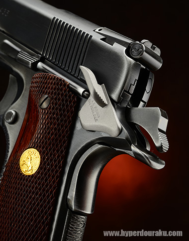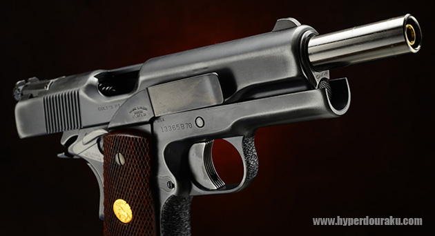 コルトガバメントのシリーズ70をベースとしたスライドとフレームの角は丸く削られ独特の存在感を放っている。このメルトダウンという加工法は現代のタクティカルガンにも採用されるほど。またスライド右側に設けられた携帯用のベルトクリップも特徴的だ。