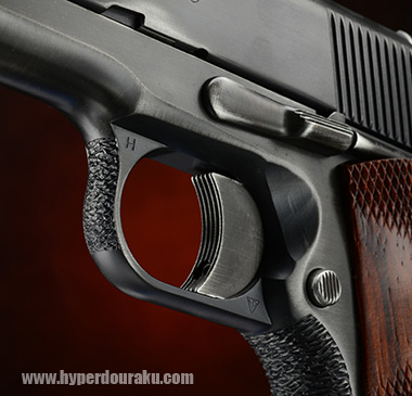 スライド左側面にはナショナルマッチの刻印。また、トリガーガードとグリップに施された滑り止め用のステッピングは上から下へと鱗のような流れの規則性があり、効果が最大限発揮するよう加工されている。