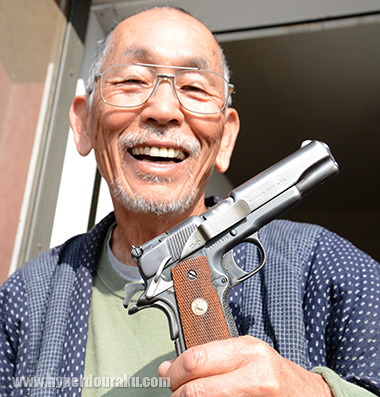 カリフォルニアの自宅にて、実銃のボブ・チャウ スペシャルを持つ、ガンフォトグラファーの永田市郎氏。70歳を超えてもなお射撃時の凛とした佇まいはさながら現代の侍。永田市郎氏自らガンハンドリングして撮影したボブチャウ スペシャルの実弾射撃動画もどうぞ!!