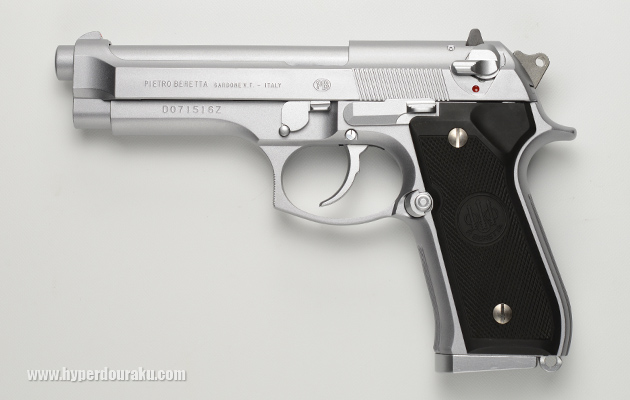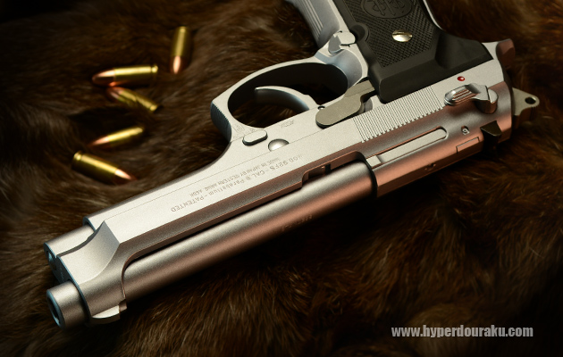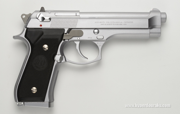 実銃のベレッタM92FS INOXはスライドがスレンレスでフレームはアルミ製。したがってシルバーの質感が微妙に異なる。押井監督のINOXにはHOGUEのワンピース・ラバーグリップが装着されている。スタイルアップももちろんだが、常夏のグアムで汗ばんだ手でグリップするにはラバーグリップは都合が良い。