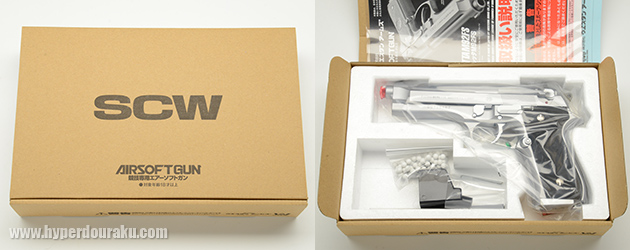 パッケージサイズは27×18×5.8cm。パッケージ内容は本体、マガジン、保護キャップ、BBローダー、取説とBB弾少々。