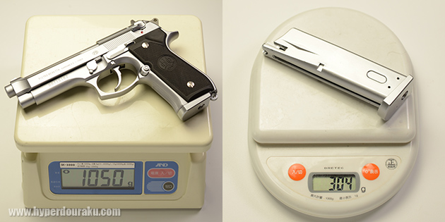 実測重量は1,050g。フル装填時の実銃に匹敵する重さ。マガジン1本の重量は304g。