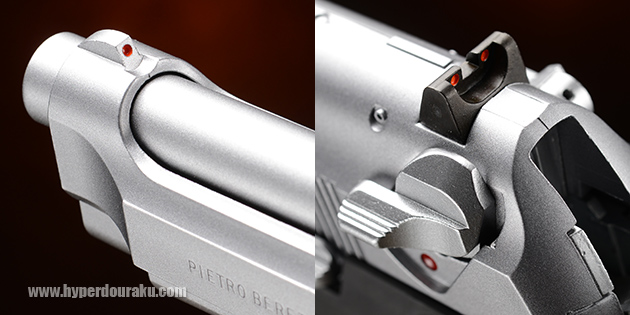フロントサイトとリアサイトにはレッドドットが入る。リアサイトは見やすいように実銃同様のブラック仕上げ。