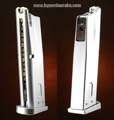 ただ、このマガジン、リップがプラ製ではなく、亜鉛ダイキャストの一体式で、かつ、シルバー塗装によるつるつるとした仕上げなので、最終5発くらいになるとブローバックした際のフィーディング時にBB弾がリップから飛んでしまう現象がしばしば発生した。そうなるとスライド内部でBB弾が噛んでしまうこともあり、装填不良が発生する。ここはぜひともプラ製リップに改修してもらいたいところ。