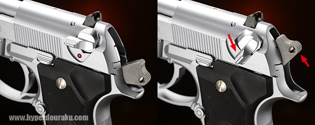 ハンマーコック時にスライドのセフティレバーをオンにすれば、安全にハンマーを倒すことができるデコック機能を装備する。