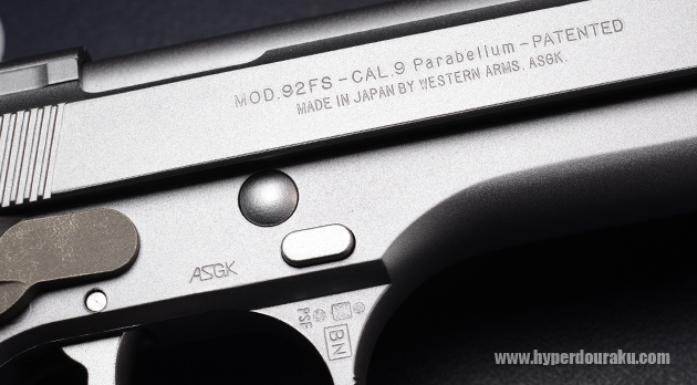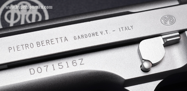 スライド左側の刻印。最近でこそベレッタUSA刻印だったり、軍用のM9刻印が多いが、WAのINOXは本家イタリアン・ベレッタ刻印。