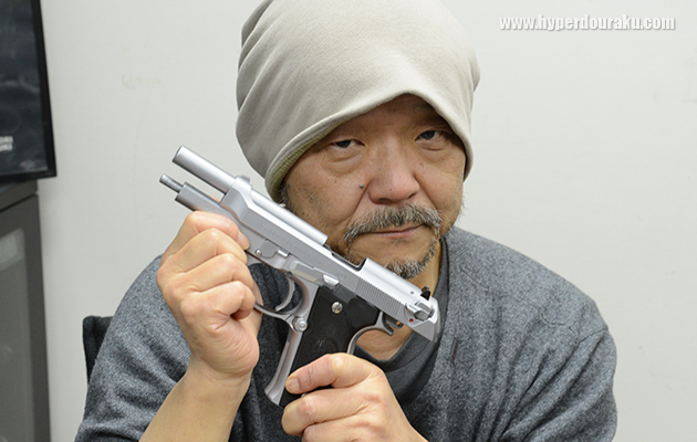 WA ベレッタ M92F INOX ソルトを手にした押井監督。実銃のほうが撃ちなれていることもあって、実銃とガスガンとの違いなどを語ってくれた。