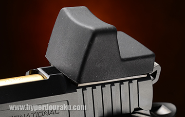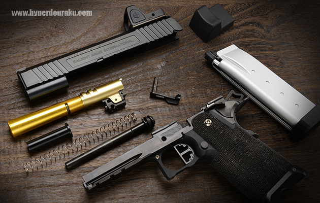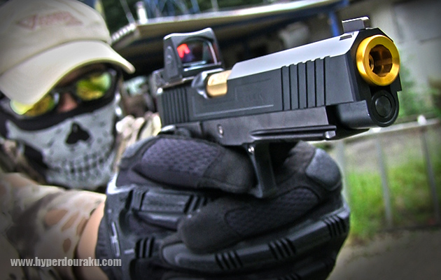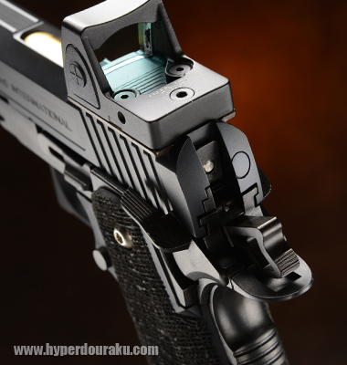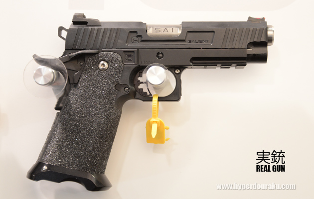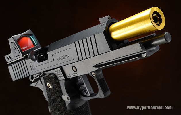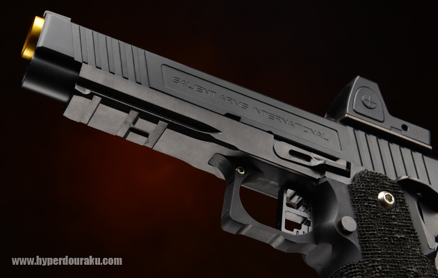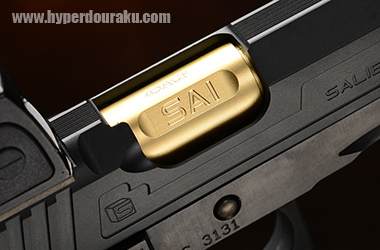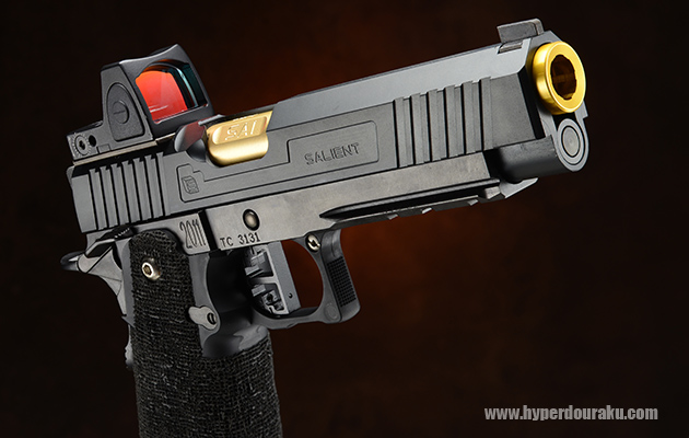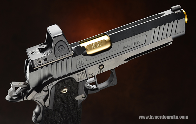 実際のところ、SAIには本モデルと全く外観が一致するモデルはリリースされていないが、いかにもSAIによってカスタムされたかのようなパーツがふんだんに盛り込まれており、スライドの加工、ゴールドに輝くバレルも美しい。またドットサイトにより、素早いエイミングが可能で、最新の1911タクティカルカスタムをハンドリングしているという気分を盛り上げてくれる。