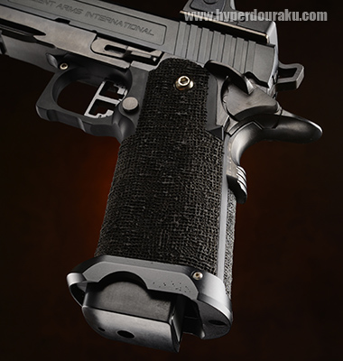 一丁づつ手作業となるグリップのステッピング加工。ハイキャパシティモデルだけあり、グリップは太めなのだが、グリップ効果が高いので安心感がある。