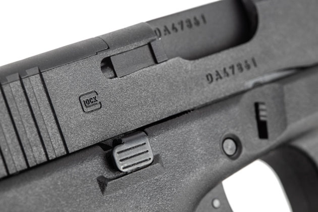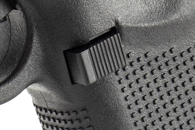 マガジンキャッチはGen.4から採用されたワイドタイプを踏襲。実銃同様、一旦フレームから取り外し、ひっくり返して付け直すことでレフティ仕様に変更可能だ。スライドストップが左右両側に設けられているGen.5ならではの嬉しい機能と言えるだろう。