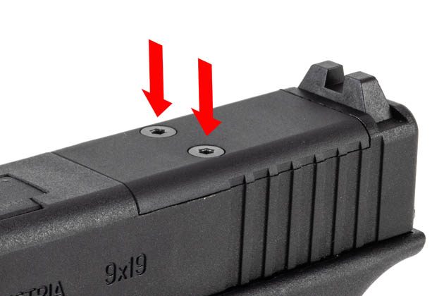 基本的な構造は実銃のGen.5 MOSと同様、まずはスライド後方上面の2本のネジでMOSカバーを取り外す必要がある。