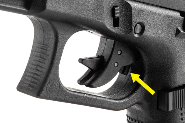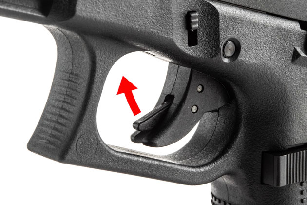 実銃Glockならではのセーフティ付きトリガーは、実銃同様中央のスリットから飛び出したトリガーセーフティに指がかかっていないと撃てない仕組みだが、G17ではここにもうひとつの安全対策を盛り込んでいる。