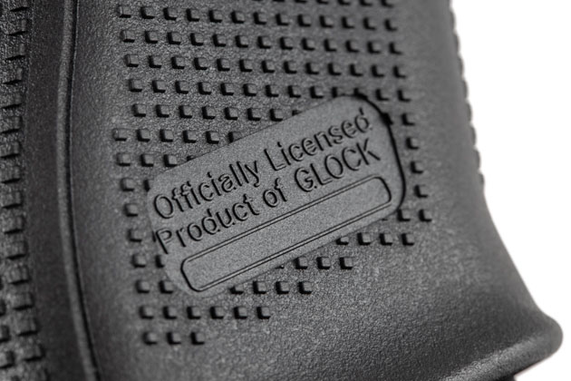 グリップ左側面に入ったGlockロゴのモールドも、ご覧のように完全再現。立体モールドとすることで滑り止めとして機能しているのが心憎いデザインだ。