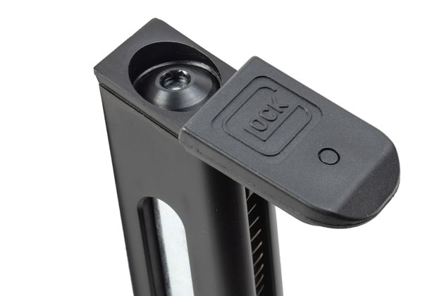 本製品に付属するG17用CO2マガジンは、当然ながら現在流通しているBG-17用CO2マガジンと完全互換で、マガジン本体を構成するパーツはほぼ共通。変わったのはGlockの正式なロゴが入ったマガジンボトムと、形状を見直すことで、マガジンボトムがより確実にロックされるようになったストッパーの2箇所のみだ。