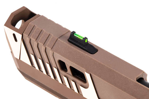 スライド上に設けられたグリーンの集光サイトは、スライド内側から2本のネジで固定されており、取り外せば実銃通りのライトニングホールが現れる。