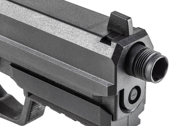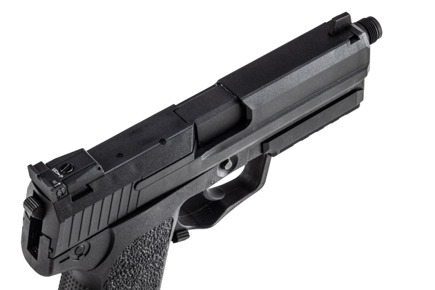 通常のUSPよりも背の高いフロントサイトは、サプレッサーハイトサイト(Suppressor Height Sight)と呼ばれるもので、その名の通りサプレッサーを取り付けた状態でのエイミングを可能とするサイトになっている。背面に刻まれた反射防止のグルーブも抜かり無く再現されており、スライド左側面のUSP Tactical 9mmという刻印が伊達ではないことを物語っている。