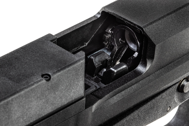 フロントと合わせて高い位置にマウントされた金属製のリアサイトは、実銃同様に上下左右の調整が可能。フロントサイト同様、サイトブレードの背面には反射防止用の細かいグルーブが刻まれている。