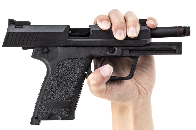 USPは、ドイツに拠点を置く言わずと知れた世界的銃器メーカー、Heckler & Koch GmbH(H&K)社が開発、販売している、9mm×19、40S&W、45ACPという3種類の弾薬に対応可能なポリマーフレームオートで、その名称はUniversal Self-loading Pistol(万能自動装填式拳銃)の略称である。
