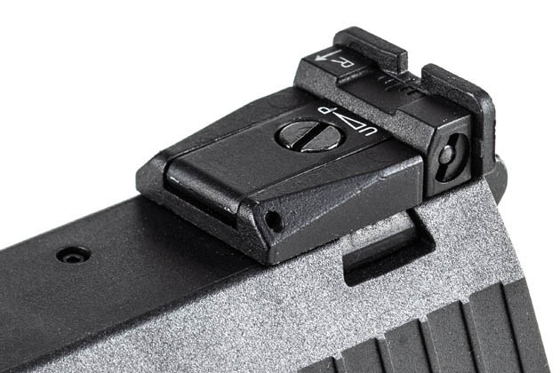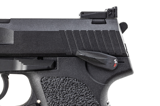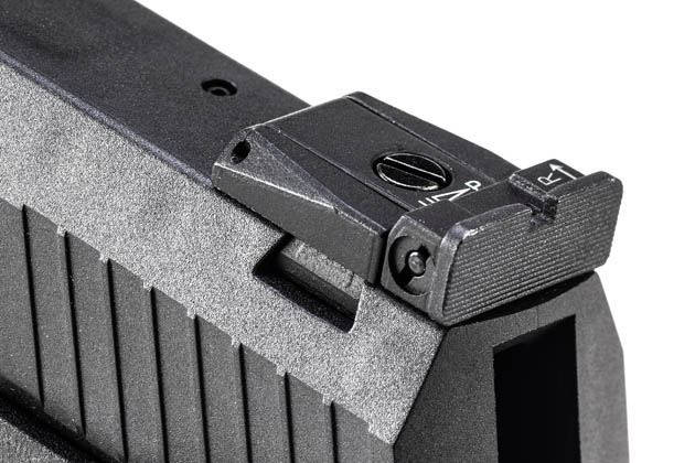 細い凸面と幅の広い凹面で構成されたスライド後方のコッキングセレーションはH&K社のハンドガンに共通する意匠で、スムーズなスライド操作を可能としてくれる。