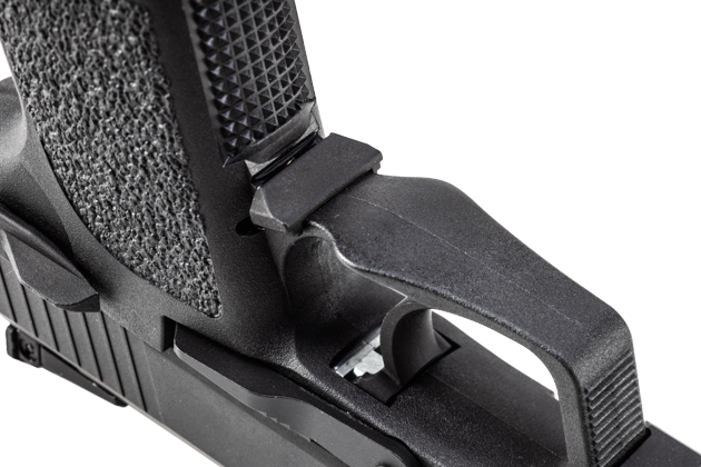 トリガーガード付け根部分のマガジンリリースレバーは下から覗くとわかるように、左右どちらからでも操作出来るデザインになっている。