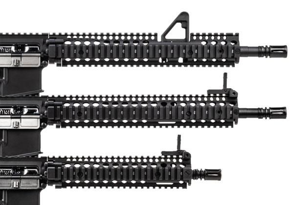 ハンドガードの長さは、M4A1とM4A1FSPが12.5インチ、MK18は9インチとなっている(下段の画像は3機種の写真を合成したもの)。