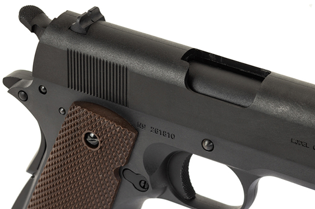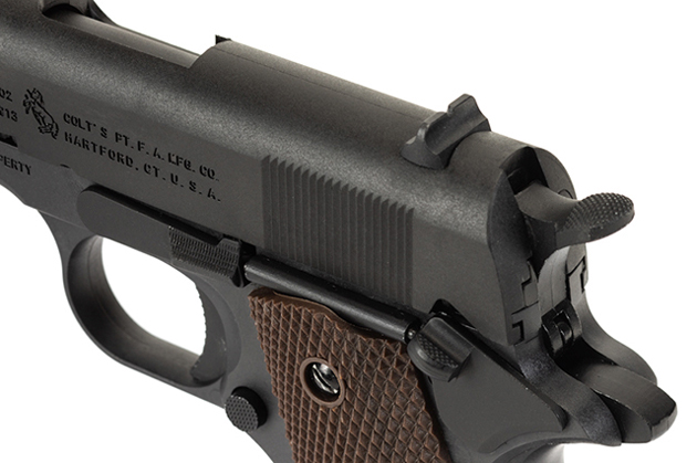 スライド左側面の刻印は、中央にランパントコルト( 跳ね馬 )の紋章が入った第二次大戦後期型を再現しているそうだが、第一次大戦開戦前に製造された M1911 にもこのタイプの刻印が入ったモデルが存在しており、この辺りについては何が正解なのかを判別するのが非常に難しいところだ。