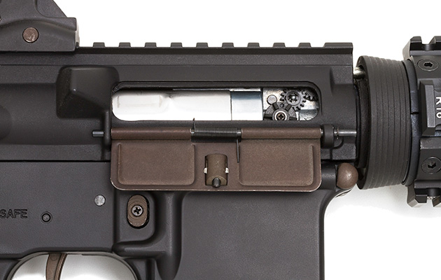 M4CQB SPORT LINEでは一体成型のモールドだった、フレーム左側面のボルトリリースレバーは今回別バーツ化。レバーを起こした状態でチャージングハンドルを引くと、ボルトカバーが後退した状態でロックされる機能が追加された。ロックされたボルトカバーは、リリースレバーを押し込めば解除されるが、実銃同様にチャージングハンドルを引くことでも解除出来る。性能には関係ないが、ガンマニアとしては実に嬉しいポイントだ。