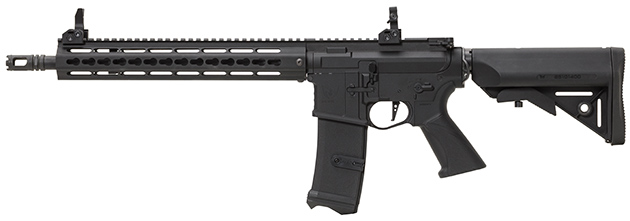 直線的な面構成によって形作られた上下レシーバーは、一般的なAR15タイプのそれから贅肉をそぎ落としたかのようなシャープさで、ひとまわり小さく造られているように錯覚するほど、銃そのものの印象を引き締めている。このデザインは、実銃の世界で最も注目されているカスタムメーカーのひとつ、Salient Arms Internationalのカスタムレシーバーをモチーフとしたものだろう。