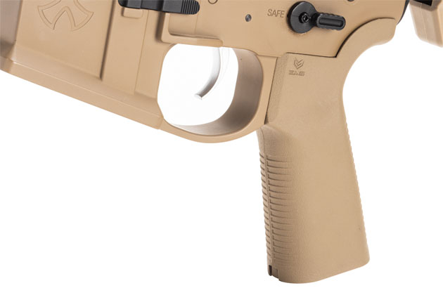 ハイトルクモーターを内蔵した樹脂製グリップはEMG (Evike Manufacturing Group)のロゴが入ったオリジナルだが、近年のトレンドである角度の立ったデザインを採用しており、脇を締めたコンパクトな構えが可能だ。