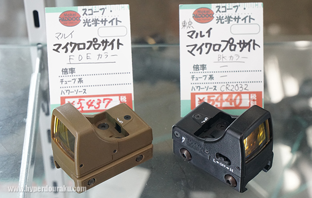 そして最後は定番の東京マルイのマイクロプロサイト。これは軽くて使い勝手が良いのでかなりおススメ。最近ブラックに加えてFDEカラーも発売されたんだ。マルイのハンドガンに搭載できるものも増えてきたし、ハイマウントを使用してSMGやライフルにも搭載できる。マルチに使えるドットサイトよ。