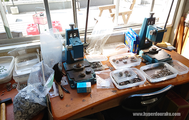 ハイプロテクションギアは全てパドックの工房で1つ1つ組み立てているんだ。