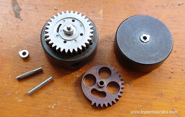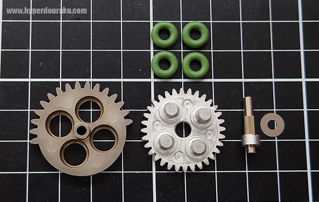 この2つのギアにグリーンのOリングが4つ挟まれていて、ダンパー機構のような衝撃の吸収効果を生み出す。なので非常に耐久性の高い電動ガンのカスタムができるんだ。