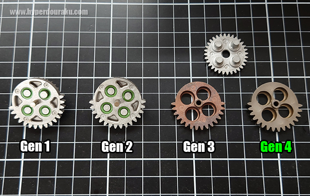 2017年にはハイサイクル電動ガンの普及もあって、これに対応するために第3世代に進化したよ。セクターギアが焼き入れ強化されて茶色になったのが特徴ね。