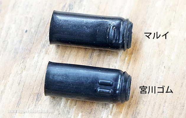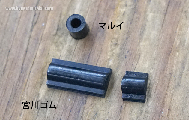 ホップアップの押しゴム形状はマルイがゴム管なのに対して、宮川ゴムのは平面タイプ。これでホップの突起を均一に押すことができるんだ。