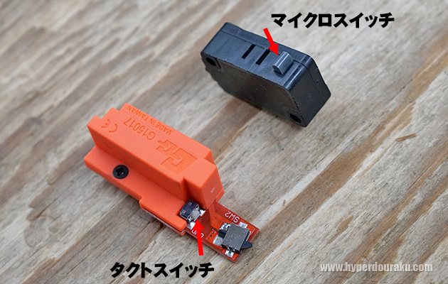 まずトリガースイッチがタクトスイッチやマイクロスイッチに置き換えられていくよ。上の黒いのがマイクロスイッチ、下のオレンジのがタクトスイッチと呼ばれるもので、従来の電動ガン用スイッチより小型でストロークも短いんだよね。これらは汎用電子部品で価格が安いというのもあるし、従来の電動ガン用スイッチやカットオフ機能がマルイの特許だったというのも普及のきっかけと言えるかな。