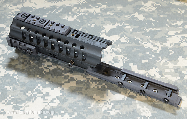 フラットトップレシーバーに固定し、バレルに干渉しないフリーフロート構造。前方のレールセクションが低くなっているがレシーバーのレイルと同じ高さだ。実測重量はオプションレイルを含めて501g。