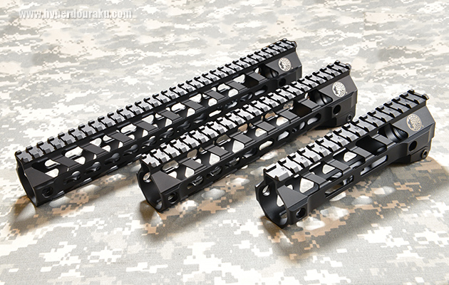 アメリカのネバダ州に拠点を置くBattle Arms Developmentのレイルハンドガード。左から12インチ、9インチ、6.7インチ。左2つはKey-MOD対応で、6.7インチがM-LOK対応バージョン。