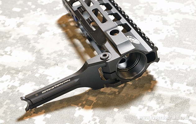 ロックレバーを起こすとバレルナットへの締め付けがフリーになり、簡単にハンドガードを取り外すことができる。レバーの素材は7075-T6アルミニウム製。
