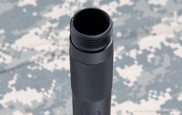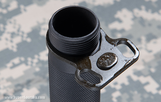 回転方向の固定溝などはなく、どの位置で固定してもOKな設計。スチール製のスリングスイベル付きレシーバーエンドが付属する。