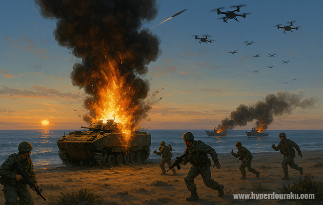 敵舟艇10隻とZBD-05B 3両が10km圏内で加速し、上陸を強行。Z-20強襲型3機が低空で接近し、歩兵30名を展開。同時に、敵艦隊が低速巡航ミサイル2発を発射。MRCVが陸自部隊と連携し、初撃と迎撃を実施。
