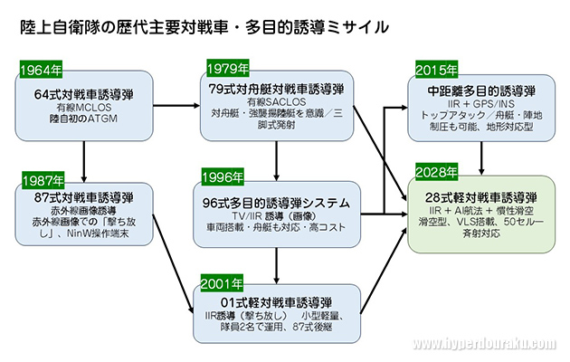 特徴: 01式軽対戦車誘導弾をベースとしたAI支援の小型対戦車・対舟艇ミサイル。タンデム構成(HEAT+HE-FRAG)弾頭で、上空からのトップアタックによりAPS突破率を高め、装甲薄弱部を貫通。固体ロケットモーターによる初期加速後、慣性飛行と滑空を併用。AI支援慣性航法+赤外線画像誘導(IIR)で妨害耐性と精度を両立。