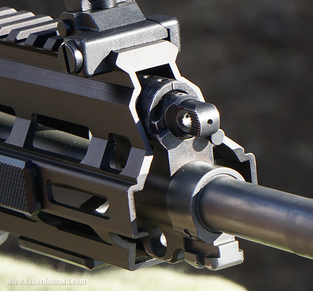 折り畳み式のフロントサイトはレイルから取り外しできる。バレル上部には三段階調整可能なガスレギュレーターを備える。小さい凹みが・、:、∴となってポジションを識別できる。