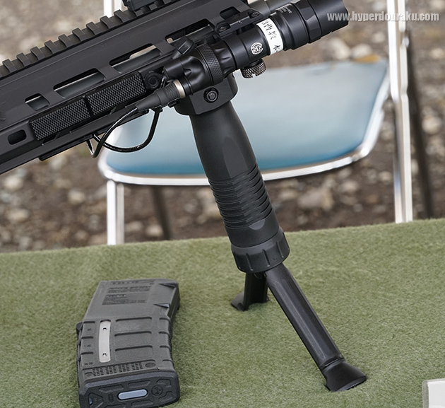 スイス B&T(Brügger & Thomet)社製のUnigripを装着。ODレバー付き、グリップ部分は樹脂製、脚はアルミ製。
