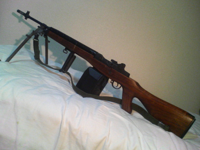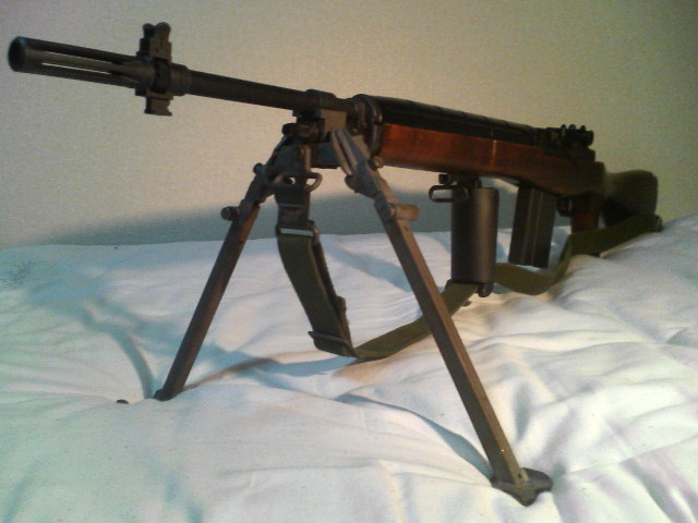 重くて頑丈にできています。グリップとトリガーが遠くオール金属バイポッドとBOXマガジンのお陰でスリングを掛けて