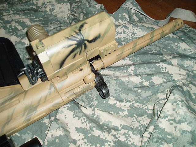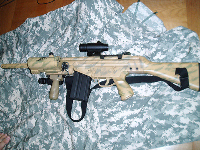 ■エントリー No.B002 ■投稿タイトル:G3SASカービングレネード ■投稿者:柘榴 さん ■コメント 派手なデザートカラーとミニランチャーで「砂嵐」をイメージした銃です。 HK51ハイダーで全長、インナーバレルをM4と同じ長さに伸ばしました。 G3SASの原型もコンセプトも全く無視したカスタムですw