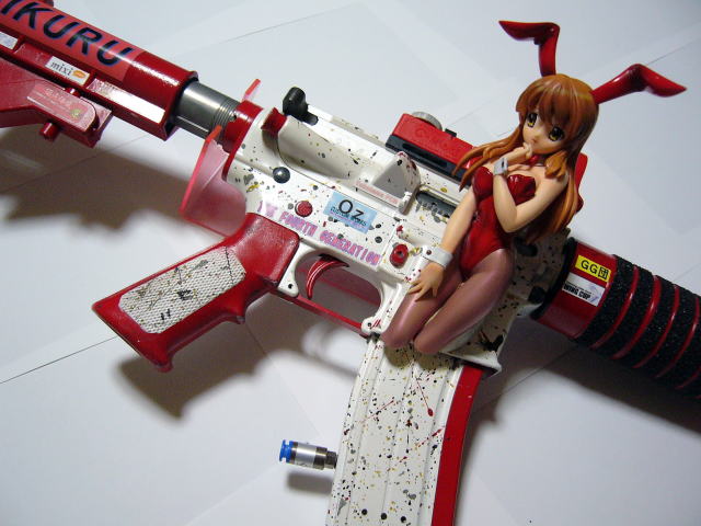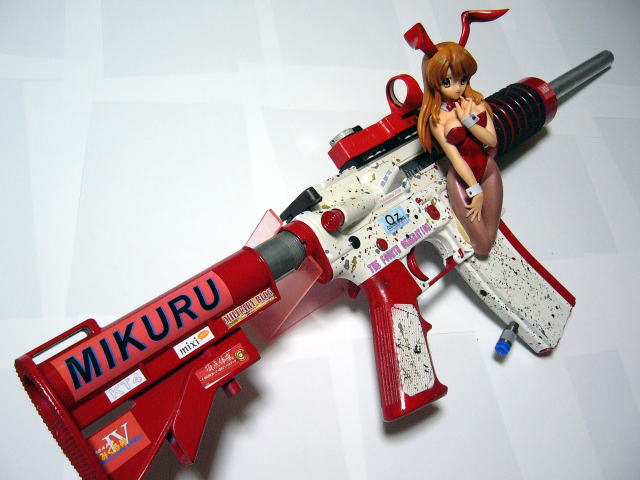 ■エントリー No.C005 ■投稿タイトル:レースガンみくる号Ⅳ ■投稿者:オレンジマン さん ■コメント スピードシューティング09アンリミッテッドに参加する為に制作したキャラクターガン。 見るものを魅了する『圧倒的な存在感』 みんなのハートを鷲掴み。 可愛いながらも本気仕様。 純正パーツ構成で、早く撃つだけなら最速作動。 オプションパーツは、Cモアとみくるちゃんです。