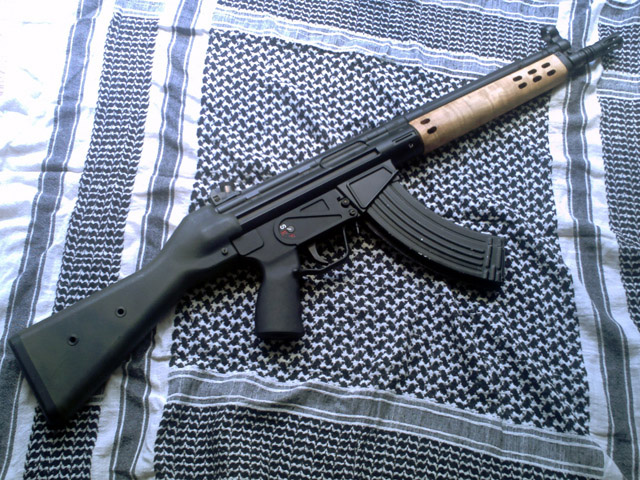 ベトナム戦前後の装備としてHK33を持っていましたが、ハンドガードが時代的に合わなかったのと「銃は木と鉄」というこだわりの下、スリムな木製ハンドガードを戦民思想にて作成してもらいました。